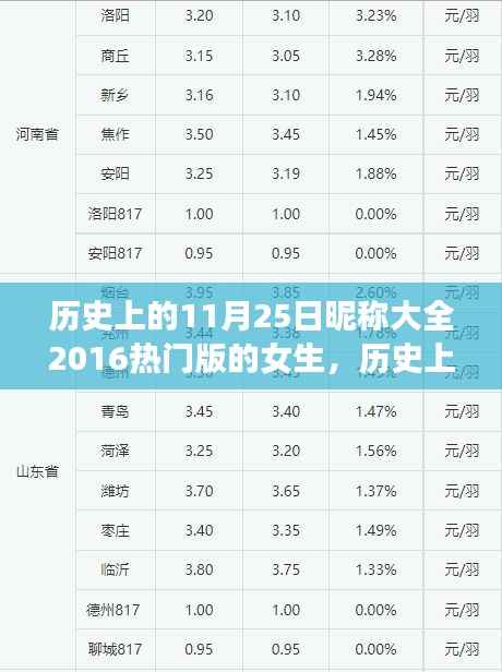 时光荏苒,岁月如梭,历史上的每一天都承载着无数的记忆与故事,特别是在网络飞速发展的今天,许多重要的日子都与年轻人的文化符号紧密相连,本文将带您走进历史上的11月25日,为您呈现那些在这一特殊日子里活跃于网络世界、充满魅力的女生们的昵称大全,让我们一起感受那份独特的青春气息。